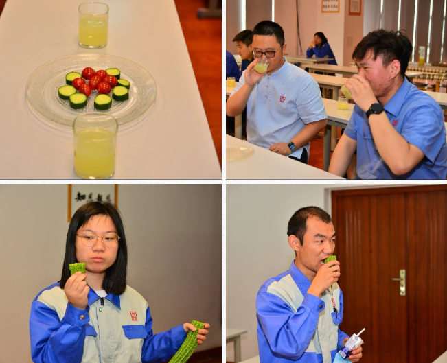 這里有特意為家人們準備的苦瓜檸檬汁,不僅喝起來(lái)清新爽口,還富含維生素等營(yíng)養物質(zhì),實(shí)在是夏季消暑的好選擇!現場(chǎng)還有家人大膽嘗試生吃苦瓜,不一會(huì )兒便戴上了“苦瓜面具”,惹出家人們一陣接一陣的歡聲笑語(yǔ)。
