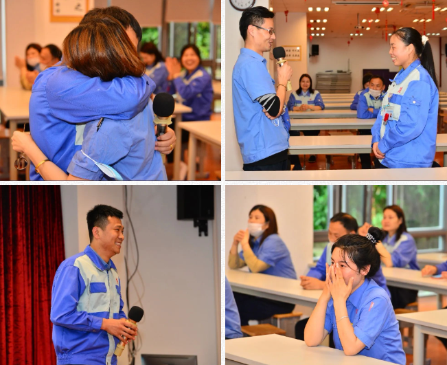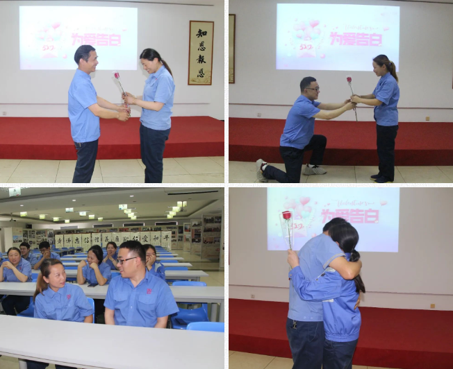 丈夫們不會(huì )什么甜言蜜語(yǔ),面對妻子們的表白,他們選擇用擁抱詮釋一切。簡(jiǎn)單的一句“太太,我愛(ài)你”包含了心中最為深沉真摯的愛(ài)。有的愛(ài)意或許從未被宣之于口,但是它一直都在。忠懇支部的魯小亮也向妻子張紅倩深情告白,他單膝下跪,引發(fā)了現場(chǎng)熱烈的氣氛。