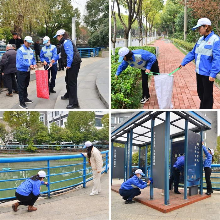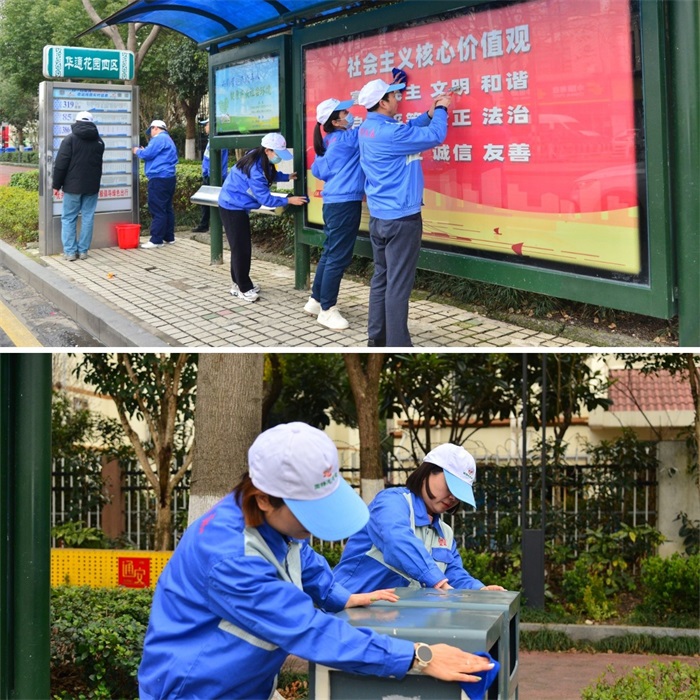 瞧!志愿者們貼心地給公交站臺“洗臉”,讓設施“煥然一新”。