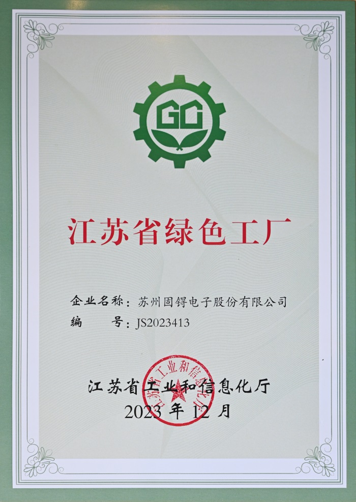 蘇州固锝電子股份有限公司被省工業(yè)和信息化廳評為江蘇省綠色工廠(chǎng),此次獲評是對蘇州固锝長(cháng)期踐行綠色環(huán)保的充分肯定。