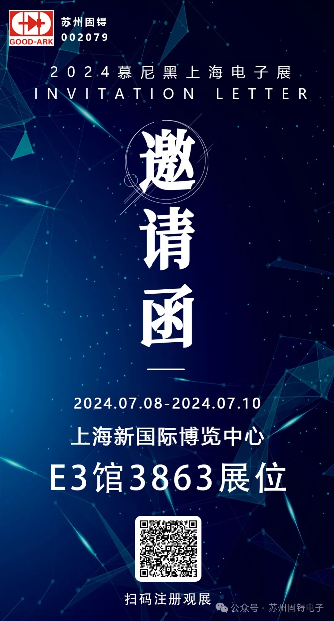 我們誠摯地邀請您參加即將于7月08日至10日在上海新國際博覽中心隆重舉行的2024慕尼黑上海電子展,蘇州固锝將攜其最新技術(shù)成果和產(chǎn)品亮相此次盛會(huì ),與業(yè)界同仁共襄盛舉。