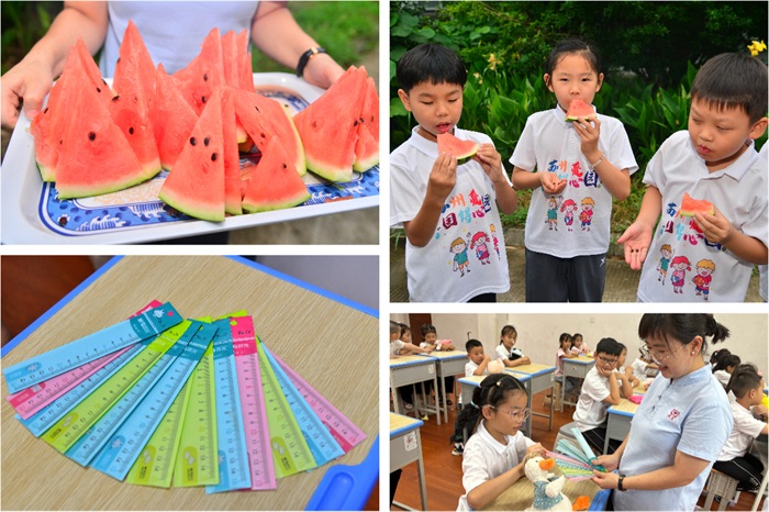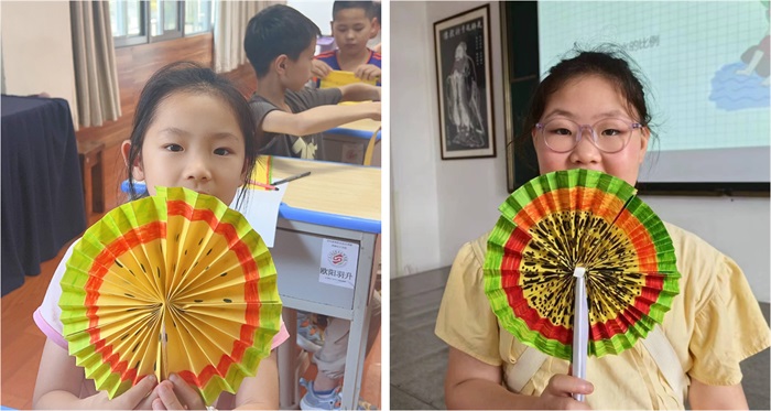 不遠處傳來(lái)的童聲,把我們吸引到多姿多彩的手工課現場(chǎng)。孩子們在老師的聲聲鼓勵中,點(diǎn)燃了DIY折扇的熱情,不一會(huì )兒,一把把帶有夏天味道的“西瓜扇”就呈現在大家的眼前。