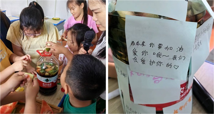 實(shí)踐課上,老師引導孩子們收集西瓜皮,二次利用制作環(huán)保酵素,為地球媽媽減負。按照1:3:10的比例,加入紅糖、西瓜皮和水后,寶貝們好奇地觀(guān)察酵素瓶,期待著(zhù)未來(lái)的變化。