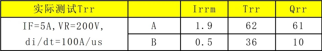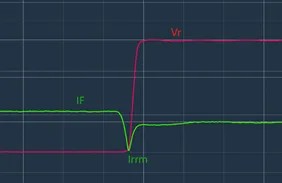 FRD應用中,除開(kāi)正向導通損耗,反向恢復損耗也非常重要。二極管整體損耗主要由這兩者共同決定。在應用中需要根據實(shí)際情況,來(lái)評估FRD的Trr選擇是否合適。