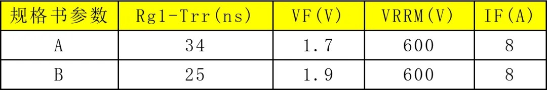 如下兩顆FRD具有相同的電流電壓規格,Trr差異較小,但是反向恢復損耗卻相差較大,在高溫條件下,差距會(huì )進(jìn)一步放大, 由此帶來(lái)的功耗差異也不能忽略。