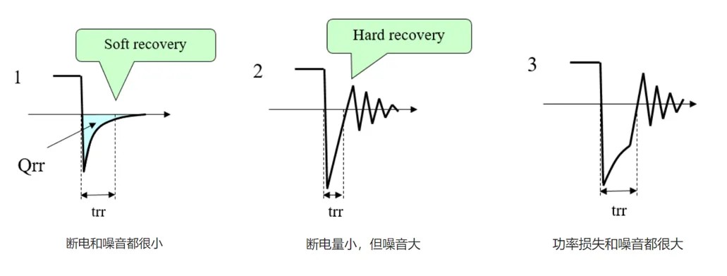 恢復電流恢復太突然時(shí),它會(huì )產(chǎn)生更多的噪音. 因此,trr不僅要小,而且需要較緩的恢復。下面數字1和3在規格中可能看起來(lái)具有相同的trr,但損耗和噪音都大不相同。此外,2號在查看規格時(shí)看起來(lái)非常好,但它會(huì )產(chǎn)生很大的噪音。