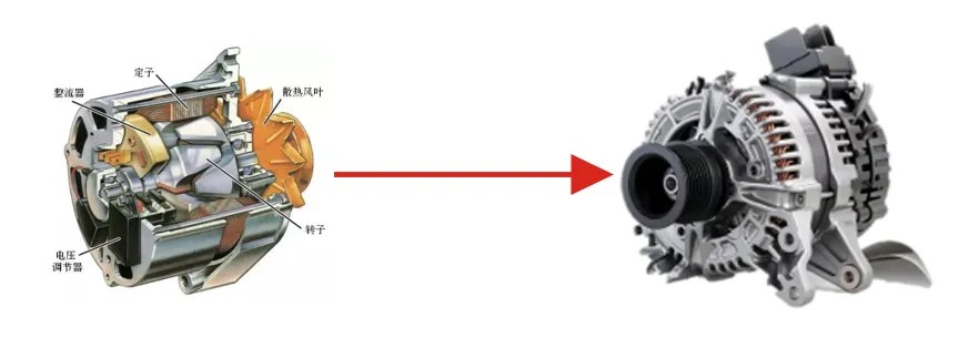 整體式交流發(fā)電機一般由定子、轉子、整流橋(橋式整流器)、調節器總成(由電刷組件和調節器組成)、前后端蓋、軸承、風(fēng)扇、皮帶輪等組成。