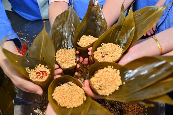 折葉、填料、包裹、捆扎......看似簡(jiǎn)單的步驟,卻需要十足的耐心與技巧。固锝家人們互相學(xué)習,有的包得棱角分明,有的則略顯"隨性",但無(wú)論形狀如何,每一個(gè)粽子都飽含著(zhù)濃濃的情誼。
